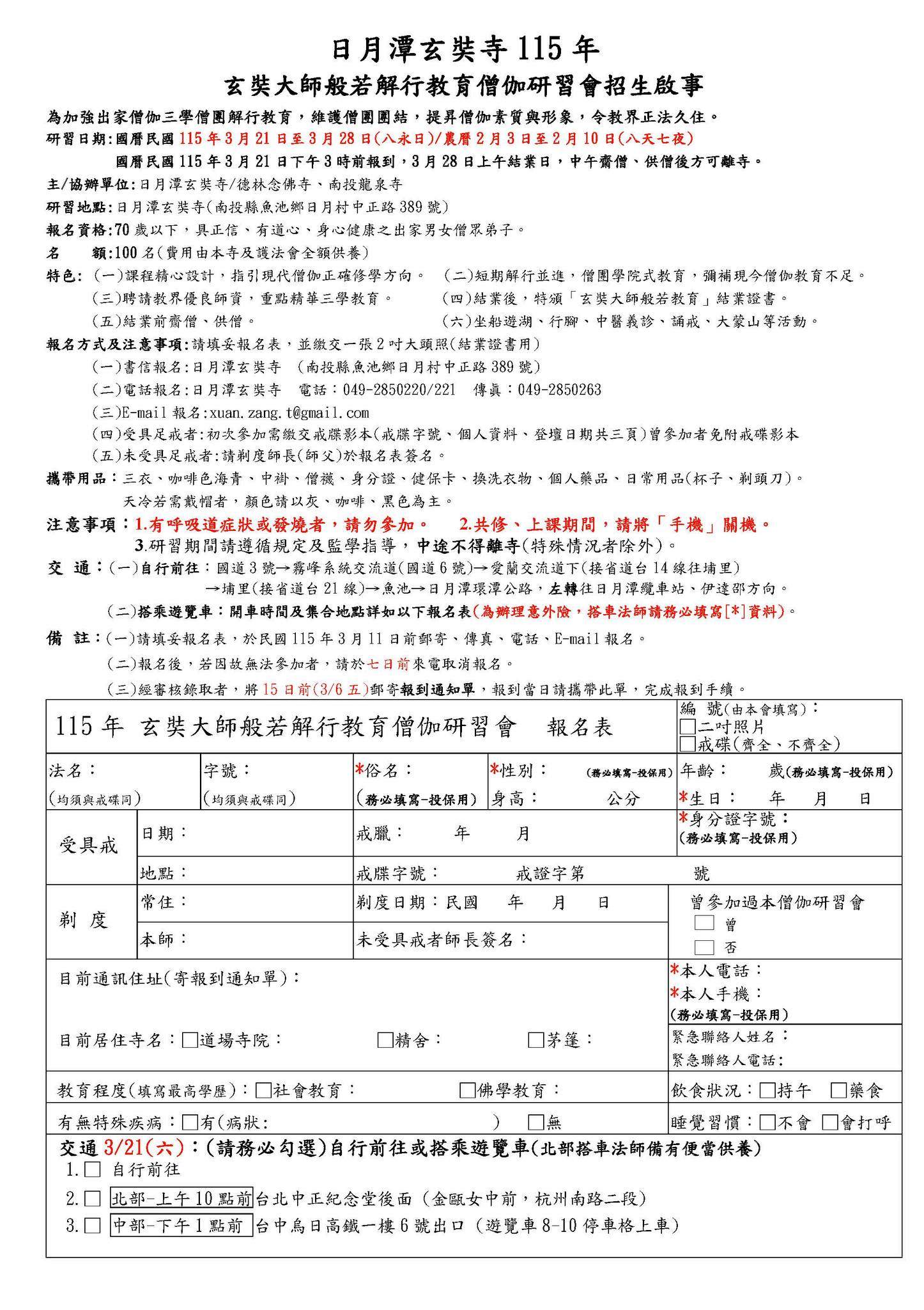 (二)電話報名:日月潭玄奘寺 電話:049-2850220/221 傳眞:049-2850263